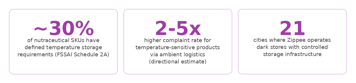 A significant share of nutraceutical and pharmaceutical SKUs are temperature-sensitive, and the problem is not limited to biologics or vaccines. Probiotics, fish oil capsules, certain herbal extracts, and multiple OTC products have defined storage conditions. Most D2C brands ship these through standard fulfillment infrastructure with ambient storage and unmonitored last-mile delivery.